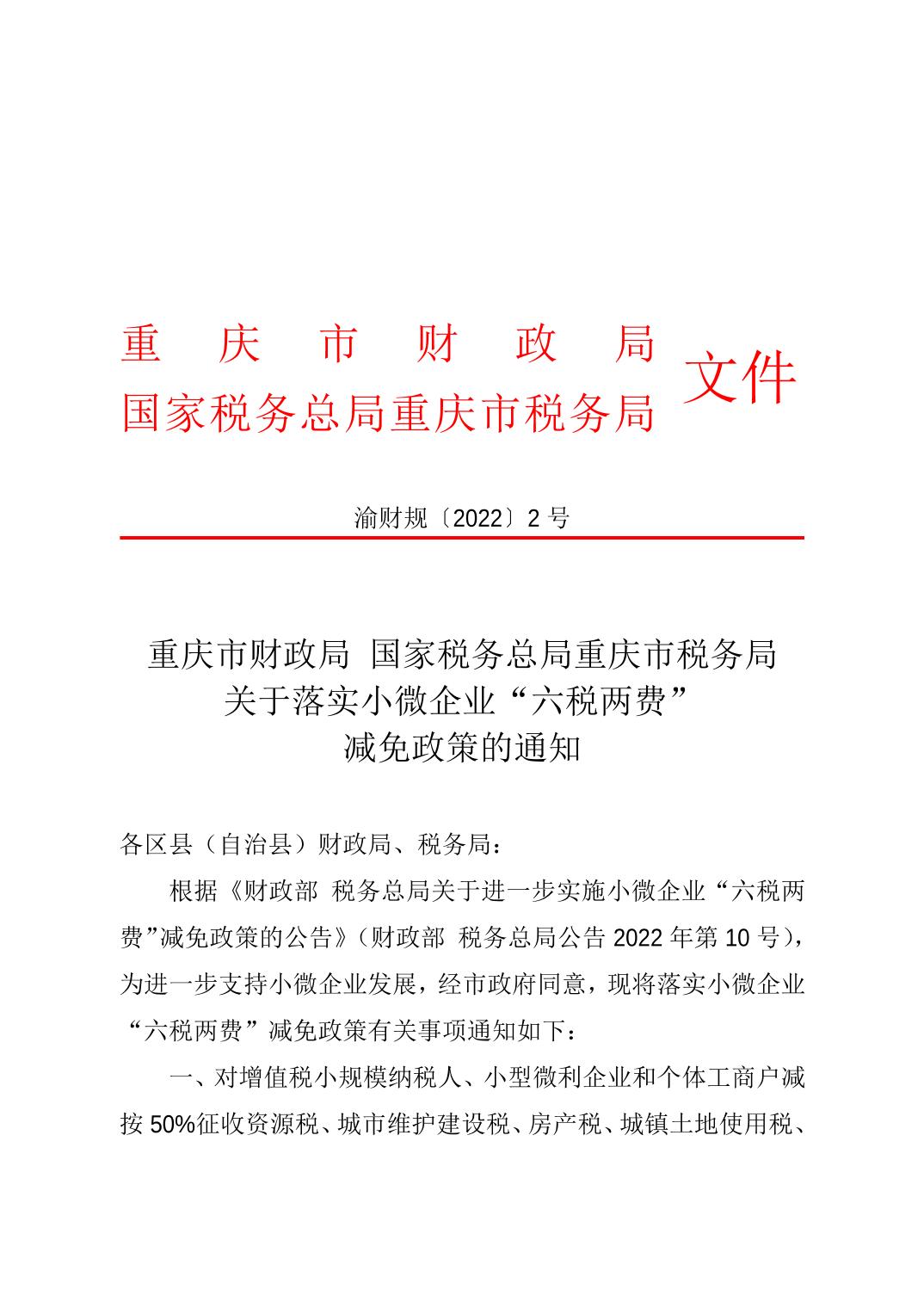 重慶市財政局 國家稅務總局重慶市稅務局關于落實小微企業“六稅兩費”減免政策的通知