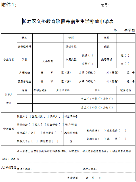 附件:1.長壽區家庭經濟困難寄宿生生活補助申請表