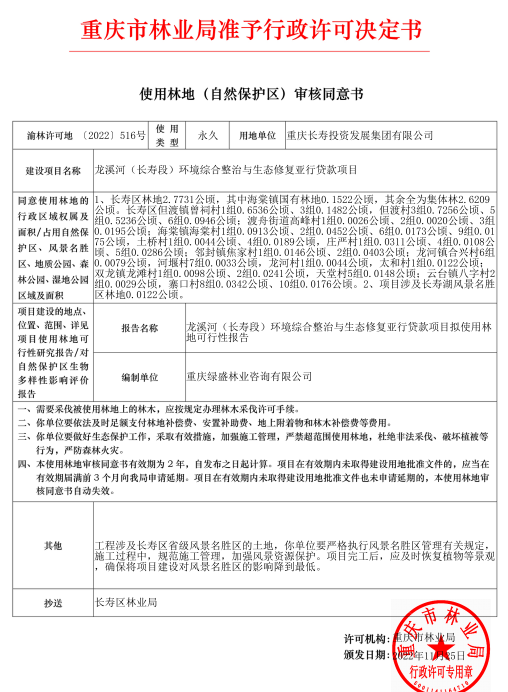 龍溪河(長壽段)環境綜合整治與生態修復亞行貸款項目行政許可決定書