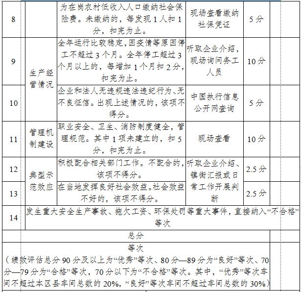 (五)績效評估。區人力社保局、區鄉村振興局每年對已認定的就業幫扶車間進行績效評估,評出“優秀”“良好”“合格”“不合格”車間,對于優秀”“良好”“合格”給予帶動就業獎補,對于“不合格”車間限期整改(不長于3個月),整改后仍達不到要求的則取消稱號并摘牌。績效評估主要圍繞就業幫扶車間穩定帶動就業能力、帶動增收能力、吸納農村低收入人口就業數量、生產經營狀況、管理機制建設、典型示范效應等內容(附件3)開展。