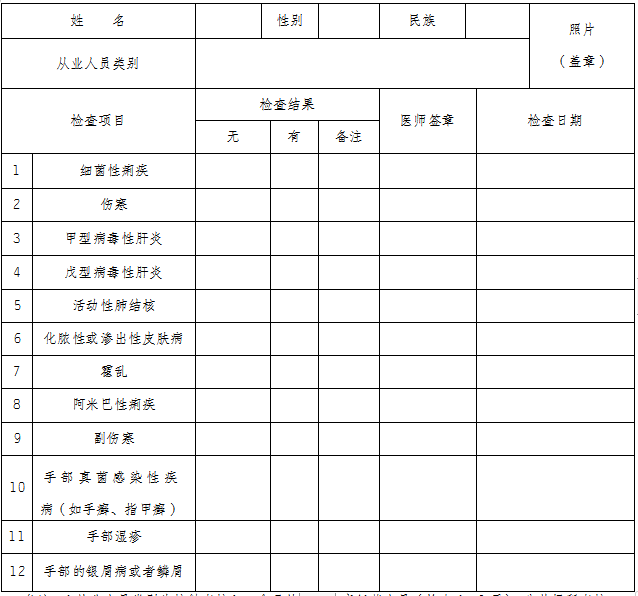 備注:1.從業人員類別為接觸直接入口食品的食品生產經營人員(檢查1—9項);公共場所直接為顧客服務的人員(檢查1—6項);直接從事供、管水的人員和直接從事水質處理器(材料)生產的人員(檢查 1—6 項);餐具、飲具集中消毒服務單位生產操作人員(檢查 1—6 項);直接從事化妝品生產的人員。(檢查 1—6、10—12 項)