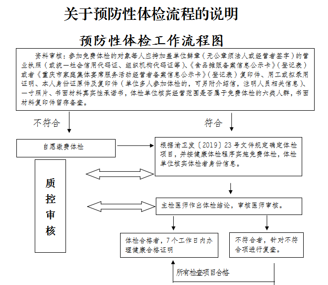 ?備注:1.資料審核的內容:根據《中華人民共和國食品安全法》《國家衛生計生委關于印發有礙食品安全的疾病目錄的通知》《公共場所衛生管理條例》《化妝品衛生監督條例》《生活飲用水衛生監督管理辦法》《重慶市村鎮供水條例》《衛生部關于印發生活飲用水衛生規范的通知》《餐飲具集中消毒單位衛生監督規范(試行)》,對以下六類人員進行免費預防性體檢:接觸直接入口食品的食品生產經營人員;公共場所直接為顧客服務的人員;直接從事供、管水的人員;直接從事水質處理器(材料)生產的人員;餐具、飲具集中消毒服務單位生產操作人員;直接從事化妝品生產的人員。