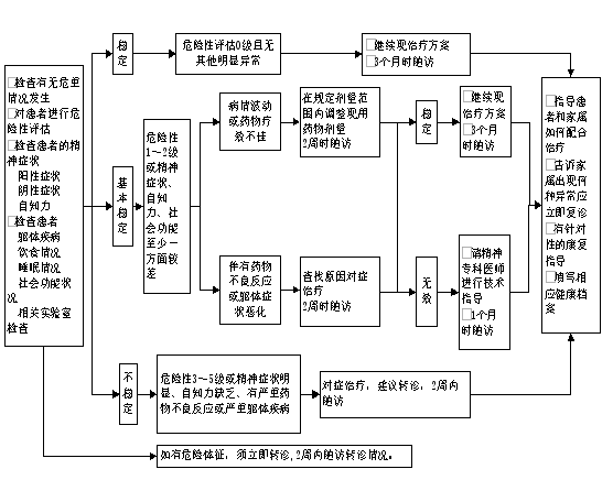 根據患者的危險性評估分級、社會功能狀況、精神癥狀評估、自知力判斷,以及患者是否存在藥物不良反應或軀體疾病情況對患者進行分類干預。
