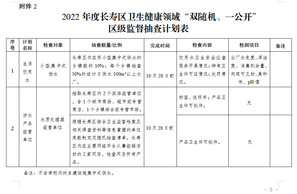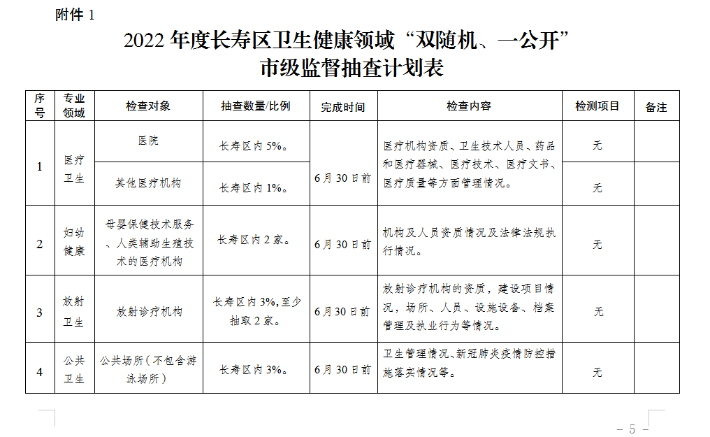 附件:1. 2022年度長壽區(qū)衛(wèi)生健康領域“雙隨機、一公開”市級監(jiān)督抽查計劃表