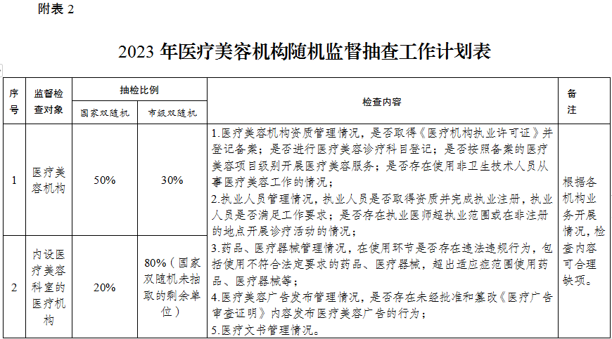 (二)醫療美容機構監督抽查。抽查全市80%的醫療美容機構,所有的內設醫療美容科室的醫療機構。具體抽查單位見市執法平臺雙隨機名單,檢查內容見附表3。