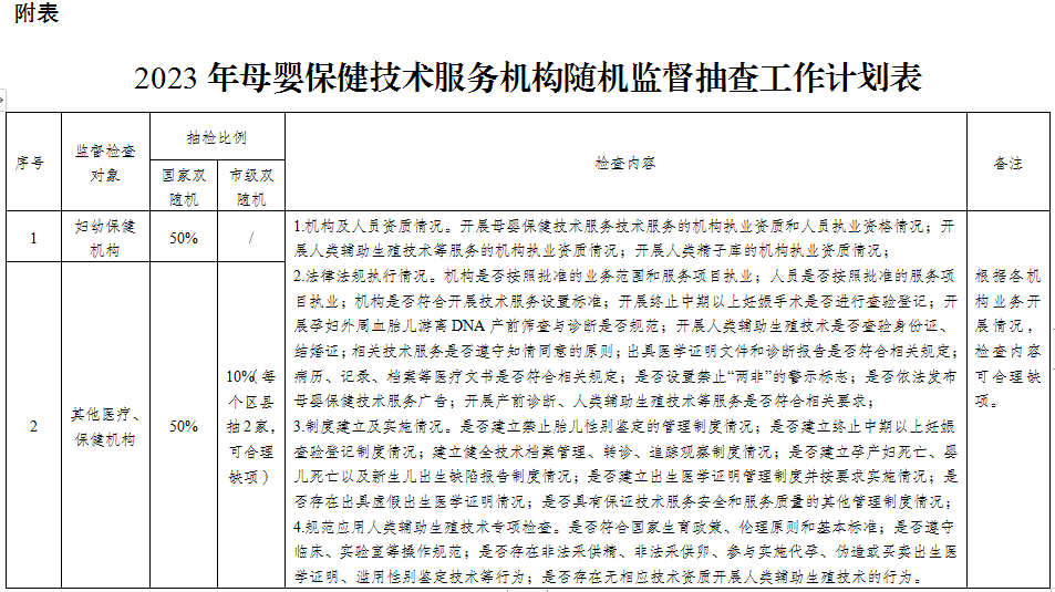 2023年母嬰保健技術服務機構隨機監督抽查計劃