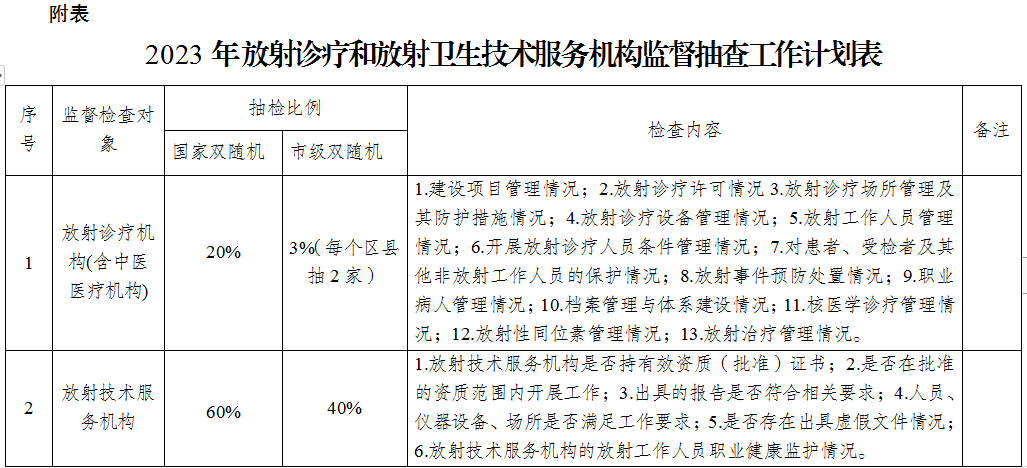 附表:2023年放射診療和放射衛生技術服務機構監督抽查工作計劃表