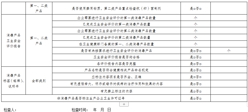 (三)第三類消毒產品生產企業監督檢查內容包括生產條件、生產過程以及消毒產品標簽和說明書等。其中尿布等排泄物衛生用品、婦女經期衛生用品生產企業重點檢查原材料衛生質量、空氣消毒設施、出廠檢驗報告。