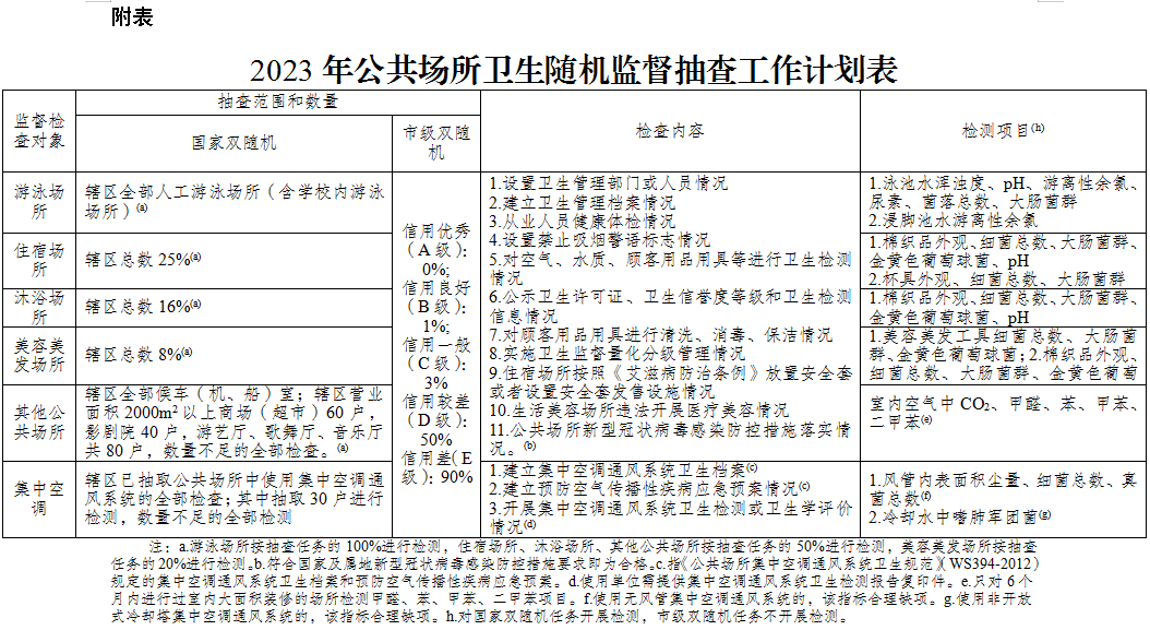 附表:2023年公共場所衛生隨機監督抽查工作計劃表