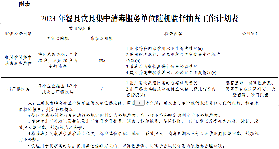 附表:2023年餐具飲具集中消毒服務單位隨機監督抽查工作計劃表