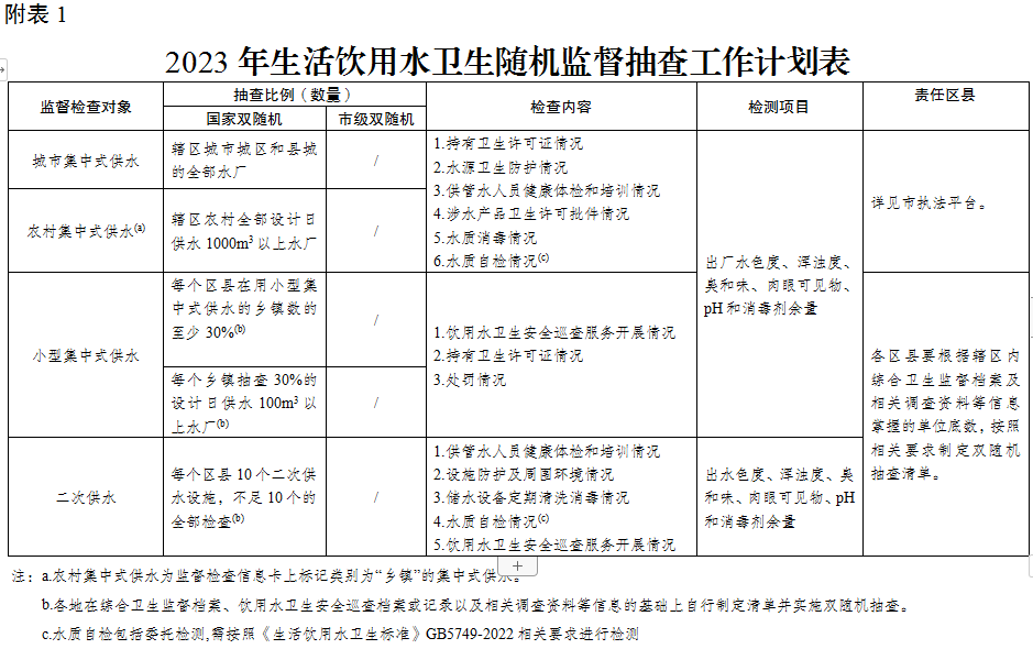 1.抽查全市所有的城市集中式供水單位,所有涉及日供水1000m3以上的農村集中式供水單位,具體抽查單位見市執法平臺雙隨機名單,檢查內容見附表1。