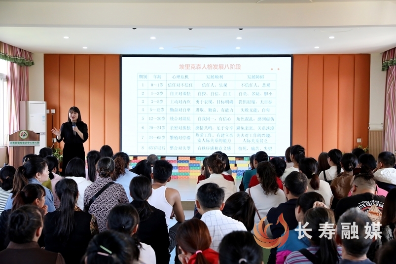 隨后,區教師發展中心教師曹耀丹以《慧做父母育見未來》為主題,從埃里克森的人格發展八階段理論出發,結合真實案例,向家長介紹孩子在各階段身心發展的特點,幫助他們正確掌握同孩子溝通的方式和教育方法,鼓勵家長學會自我調節,保持情緒穩定,建立積極的家庭氛圍。