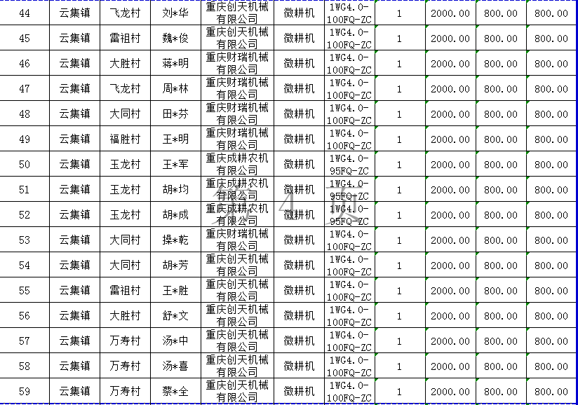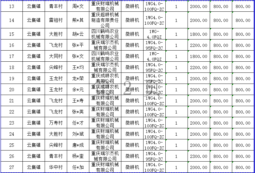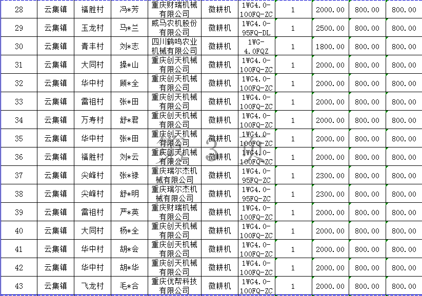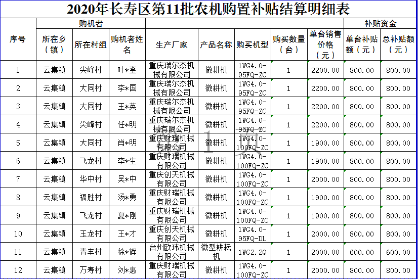 2020年度長壽區云集鎮第11批農機購置補貼結算明細表
