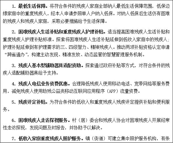 1.最低生活保障。將符合條件的殘疾人家庭全部納入最低生活保障范圍,低保邊緣家庭中的重度殘疾人,經(jīng)本人申請參照單人戶納入低保。對納入低保后生活仍有圖難的殘疾人和殘疾人家庭,采取必要措施給予生活保障。 2.困難殘疾人生活補(bǔ)貼和重度殘疾人護(hù)理補(bǔ)貼。適當(dāng)提高困難殘疾人生活補(bǔ)貼和重度殘疾人護(hù)理補(bǔ)貼標(biāo)準(zhǔn)。探索將困難殘疾人生活補(bǔ)貼延伸到低收入家庭中的殘疾人;護(hù)理補(bǔ)貼延伸到有護(hù)理需求的三、四級智力、精神殘疾人。推動兩項(xiàng)補(bǔ)貼資格認(rèn)定申請“跨省通辦”,構(gòu)建主動發(fā)現(xiàn)、精準(zhǔn)發(fā)放、動態(tài)監(jiān)管的智慧管理服務(wù)機(jī)制。 3.殘疾人基本型輔助器具適配資助。探索通過政府補(bǔ)貼等方式,對符合條件的殘疾人適配輔助器具給予支持。 4.殘疾人電信業(yè)務(wù)資費(fèi)優(yōu)惠。合理降低殘疾人使用移動電話、寬帶網(wǎng)絡(luò)等服務(wù)費(fèi)用,減免殘疾人使用助殘公益類移動互聯(lián)網(wǎng)應(yīng)用程序(APP)流量資費(fèi)。 5.殘疾評定補(bǔ)貼。為符合條件的低收入和重度殘疾人殘疾評定提供補(bǔ)貼和便利服務(wù)。 6.困難殘疾人走訪探視服務(wù)。村(居)委會和殘疾人協(xié)會對困難殘疾人開展經(jīng)常性走訪探視,發(fā)現(xiàn)問題及時報(bào)告,并協(xié)助予以解決。 7.低收入家庭重度殘疾人照護(hù)服務(wù)。鎮(zhèn)(街道)可建立集中照護(hù)服務(wù)機(jī)構(gòu),有條件的村(社區(qū))依托公共服務(wù)設(shè)施,為符合條件的重度殘疾人提供集中照護(hù)、日間照料、居家服務(wù)、鄰里互助等多種形式的社會化照護(hù)服務(wù)。