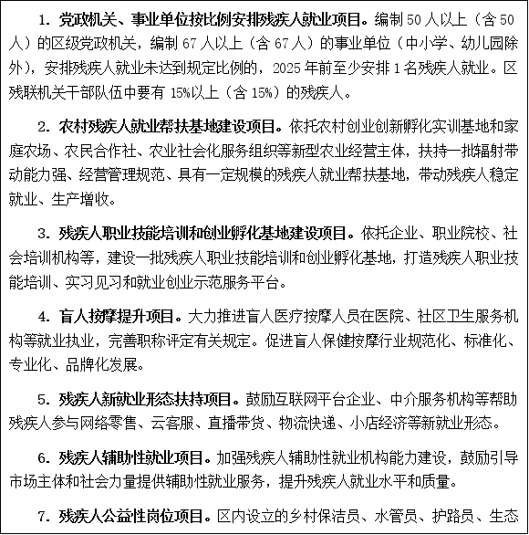 1.黨政機(jī)關(guān)、事業(yè)單位按比例安排殘疾人就業(yè)項(xiàng)目。編制50人以上(含50人)的區(qū)級黨政機(jī)關(guān),編制67人以上(含67人)的事業(yè)單位(中小學(xué)、幼兒園除外),安排殘疾人就業(yè)未達(dá)到規(guī)定比例的,2025年前至少安排1名殘疾人就業(yè)。區(qū)殘聯(lián)機(jī)關(guān)干部隊(duì)伍中要有15%以上(含15%)的殘疾人。 2.農(nóng)村殘疾人就業(yè)幫扶基地建設(shè)項(xiàng)目。依托農(nóng)村創(chuàng)業(yè)創(chuàng)新孵化實(shí)訓(xùn)基地和家庭農(nóng)場、農(nóng)民合作社、農(nóng)業(yè)社會化服務(wù)組織等新型農(nóng)業(yè)經(jīng)營主體,扶持一批輻射帶動能力強(qiáng)、經(jīng)營管理規(guī)范、具有一定規(guī)模的殘疾人就業(yè)幫扶基地,帶動殘疾人穩(wěn)定就業(yè)、生產(chǎn)增收。 3.殘疾人職業(yè)技能培訓(xùn)和創(chuàng)業(yè)孵化基地建設(shè)項(xiàng)目。依托企業(yè)、職業(yè)院校、社會培訓(xùn)機(jī)構(gòu)等,建設(shè)一批殘疾人職業(yè)技能培訓(xùn)和創(chuàng)業(yè)孵化基地,打造殘疾人職業(yè)技能培訓(xùn)、實(shí)習(xí)見習(xí)和就業(yè)創(chuàng)業(yè)示范服務(wù)平臺。 4.盲人按摩提升項(xiàng)目。大力推進(jìn)盲人醫(yī)療按摩人員在醫(yī)院、社區(qū)衛(wèi)生服務(wù)機(jī)構(gòu)等就業(yè)執(zhí)業(yè),完善職稱評定有關(guān)規(guī)定。促進(jìn)盲人保健按摩行業(yè)規(guī)范化、標(biāo)準(zhǔn)化、專業(yè)化、品牌化發(fā)展。 5.殘疾人新就業(yè)形態(tài)扶持項(xiàng)目。鼓勵互聯(lián)網(wǎng)平臺企業(yè)、中介服務(wù)機(jī)構(gòu)等幫助殘疾人參與網(wǎng)絡(luò)零售、云客服、直播帶貨、物流快遞、小店經(jīng)濟(jì)等新就業(yè)形態(tài)。 6.殘疾人輔助性就業(yè)項(xiàng)目。加強(qiáng)殘疾人輔助性就業(yè)機(jī)構(gòu)能力建設(shè),鼓勵引導(dǎo)市場主體和社會力量提供輔助性就業(yè)服務(wù),提升殘疾人就業(yè)水平和質(zhì)量。 7.殘疾人公益性崗位項(xiàng)目。區(qū)內(nèi)設(shè)立的鄉(xiāng)村保潔員、水管員、護(hù)路員、生態(tài)護(hù)林員、社會救助協(xié)理員、農(nóng)家書屋管理員、社區(qū)服務(wù)人員等公益性崗位優(yōu)先安排殘疾人。 |
